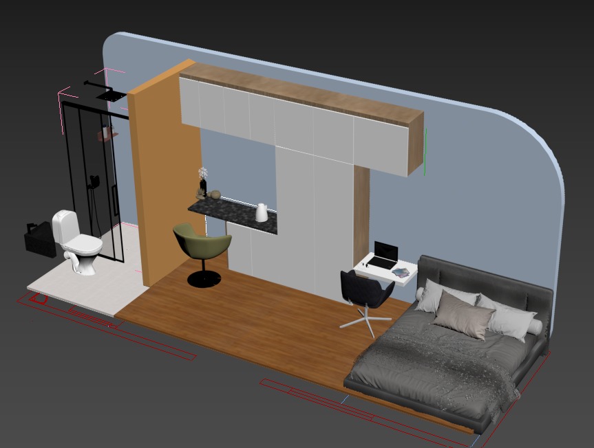 Experience a perfectly designed modern bedroom that blends comfort, functionality, and elegance. This thoughtfully planned space features a cozy bed area, a minimal work desk, stylish overhead storage, and a sleek glass-partition bathroom โ all within one seamless design.